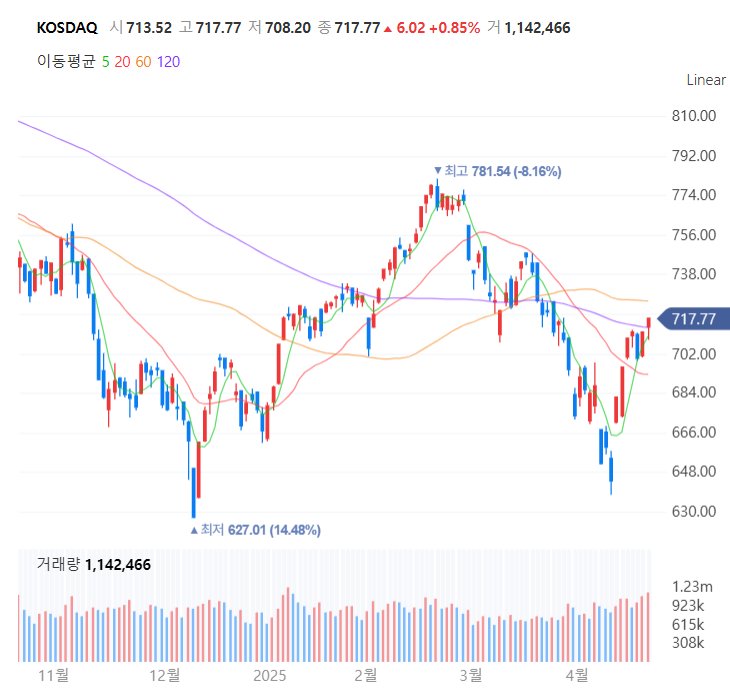 코스닥 지수는 0.85% 상승한 717.77로 마감.