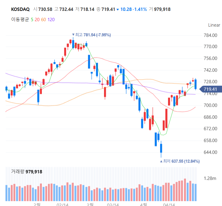 코스닥 지수는 1.41% 하락한 719.41로 마감. 외국인과 기관이 각각 590억 원, 1139억 원 순매도.