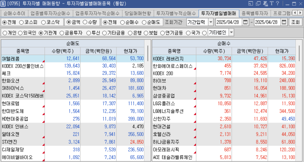 순매도는 통신, 조선, 제약바이오 반도체 등을 순매도함.