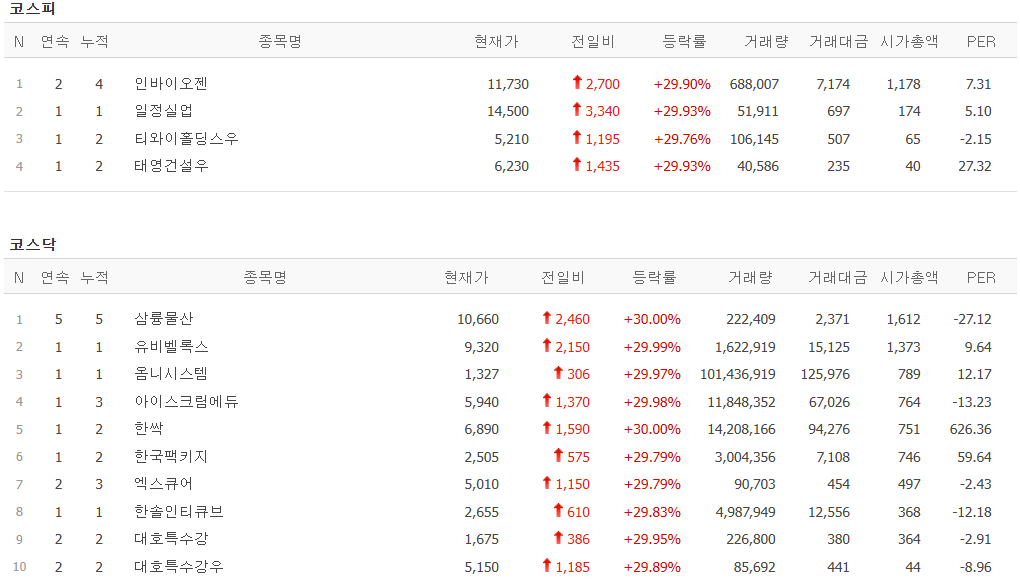 오늘의 상한가 종목