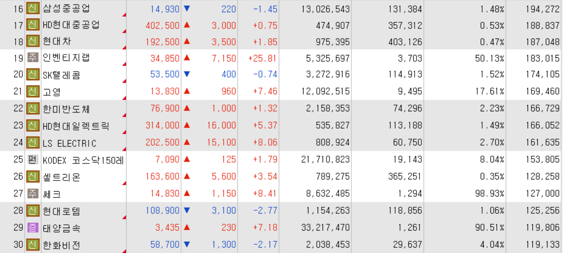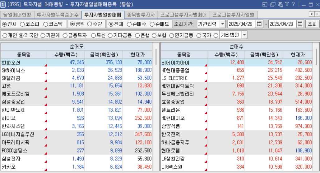 오늘 외국인 순매수 상위 종목에서는 전력, 원전, 식품, 금융, 화장품을 순매수