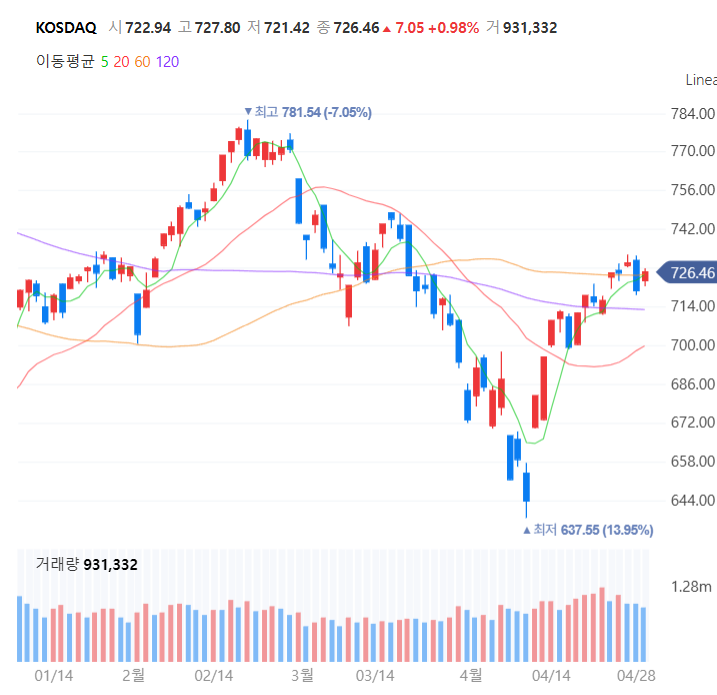 코스닥 지수는 양매수가 들어오면서 상승 마감. 코스닥 지수는 0.98% 상승한 726.46으로 마감.