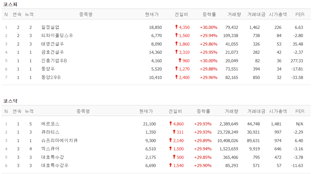 오늘의 상한가 종목은 13종목인데 코스피 7 종목은 시총이 작은 우선주 종목임.