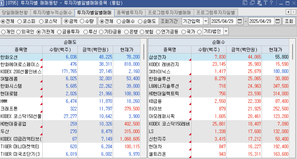 기관 순매수 종목은 반도체, 2차전지, 전력, 자동차, 화장품, 금융 등을 순매수