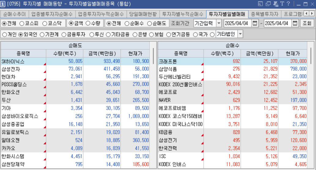 오늘의 외국인 순매수 종목은 게임, 식품, 원전,2차 전지, 전력 , 금융임, 순매수 금액이 크지 않음.