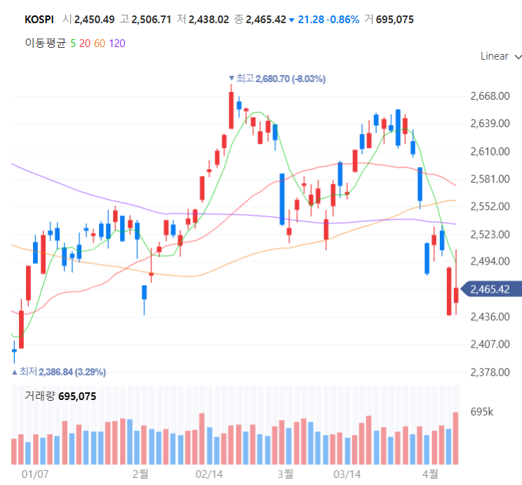 코스피 지수는 0.86% 하락한 2465.42로 마감. 외국인이 1조 7869억 원 순매도, 기관이 6211억 원 순매수.