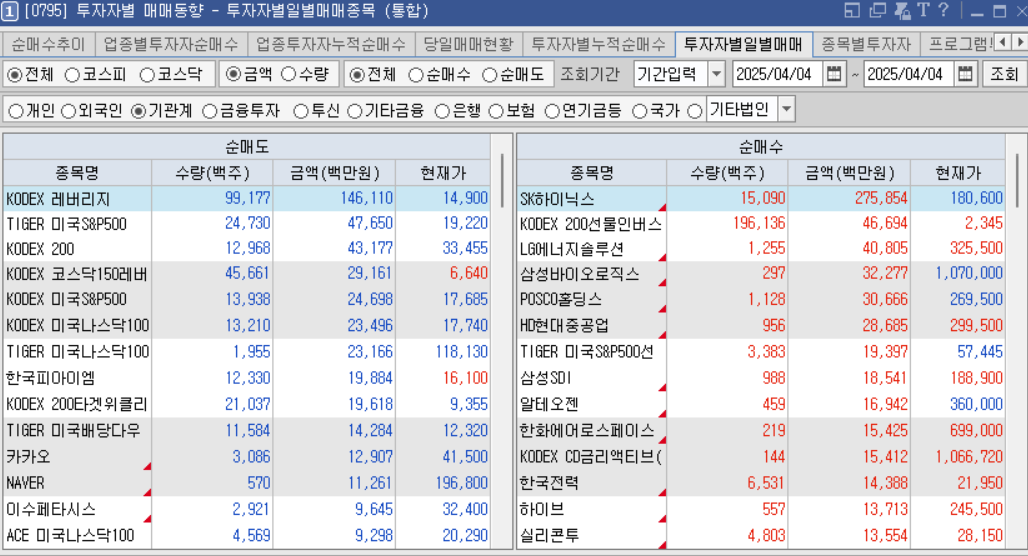 기관 순매수 종목에서는 반도체, 2차전지, 제약바이오, 방산, 전력, 화장품, 엔터를 순매수했고 sk하이닉스를