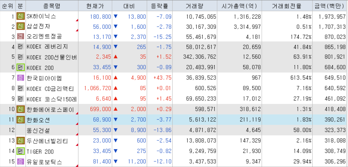 오늘 거래대금 상위 종목에서는 신규상장주 한국피아이엠이 큰 변동성을 보였지만 43.75% 상승하며