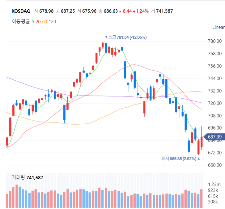 코스닥 지수는 0.57% 상승한 687.39로 마감. 외국인이 885억 원 순매도, 기관이 730억 원 순매수.