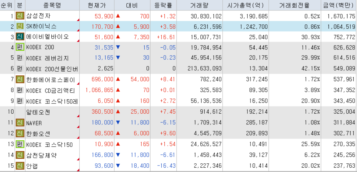 오늘 거래대금 상위 종목에서는 제약바이오, 방산, AI 관련주, 대선테마주가 크게 상승을 보였고