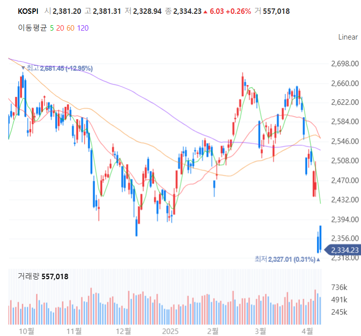 코스피 지수는 0.26% 상승한 2334.23으로 마감. 외국인과 기관이 각각 6425억 원, 898억 원 순매도.