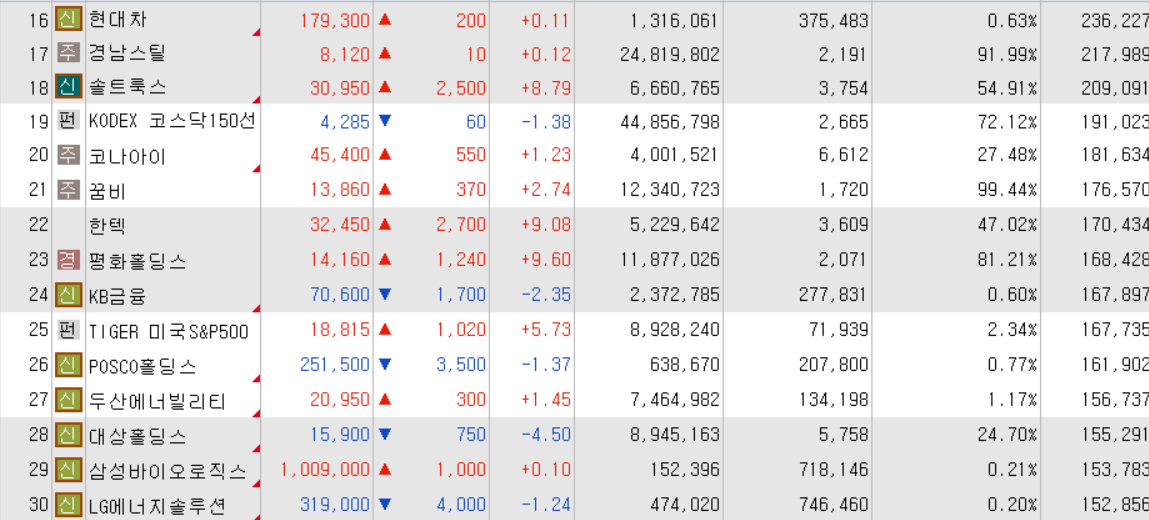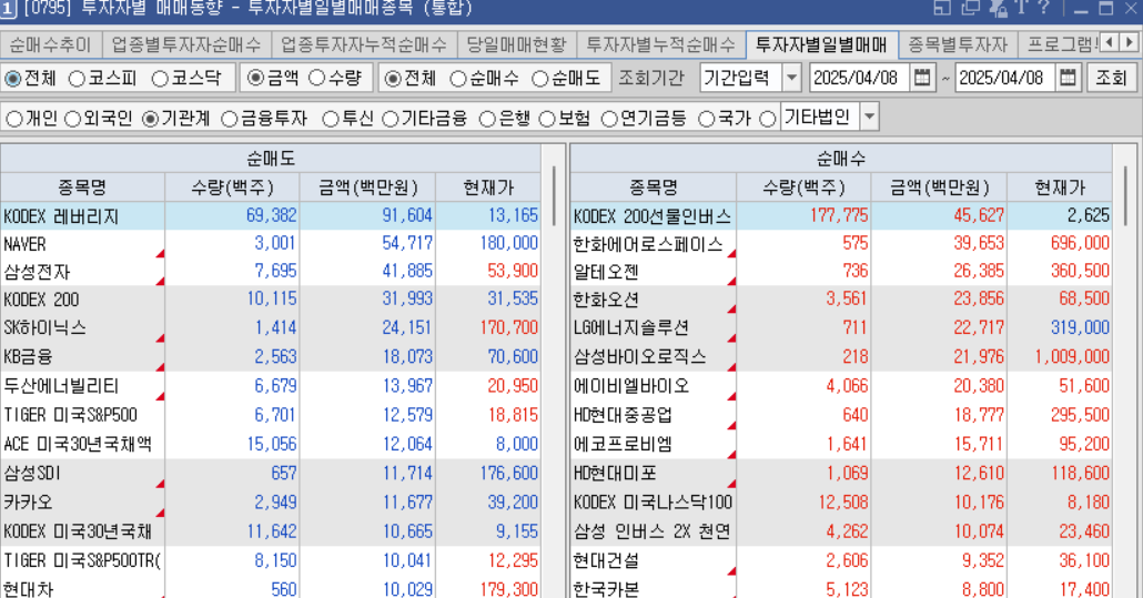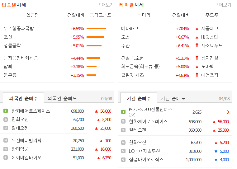 오늘 기관 순매수 종목은 방산, 조선, 제약바이오, 2차 전지,건설을 순매수함.