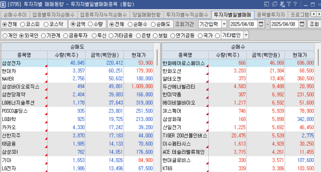 순매도 종목은 반도체, 금융, 원전, 2차전지, 자동차, 인터넷을 순매도함.