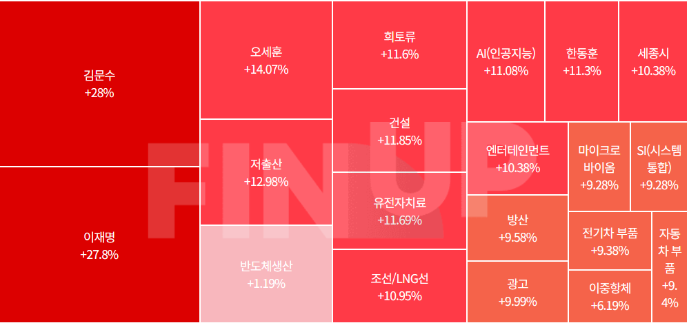이재명테마주 = 상지건설(상), 위세아이텍(상), 크라우드웍스(상), 시공테크(26.98%), 수산아이앤티(22.24%)