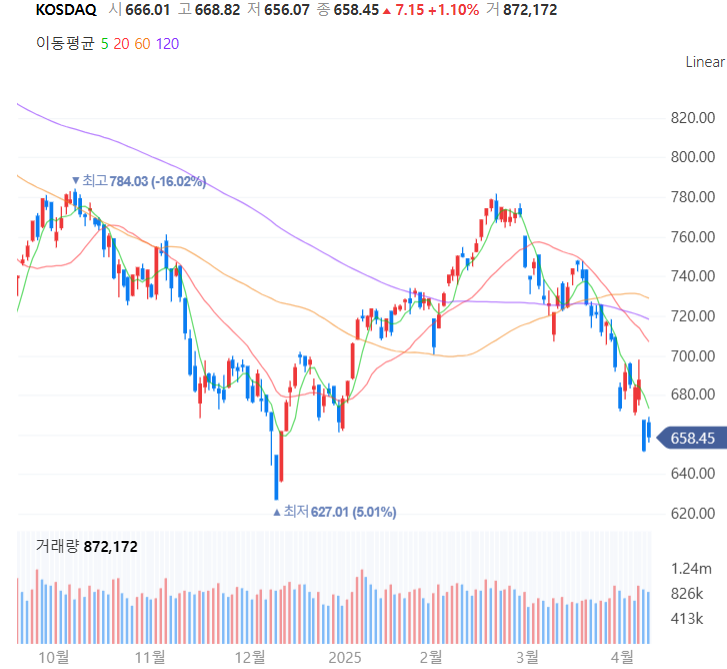 코스닥 지수는 1.10% 상승한 658.45로 마감. 기관이 1530억 원 순매수, 외국인이 732억 원 순매도.