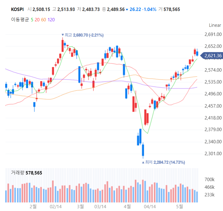 코스피는 0.73% 하락한 2621.36으로 마감. 외국인이 2644억 원 순매수, 기관이 3859억 원 순매도.