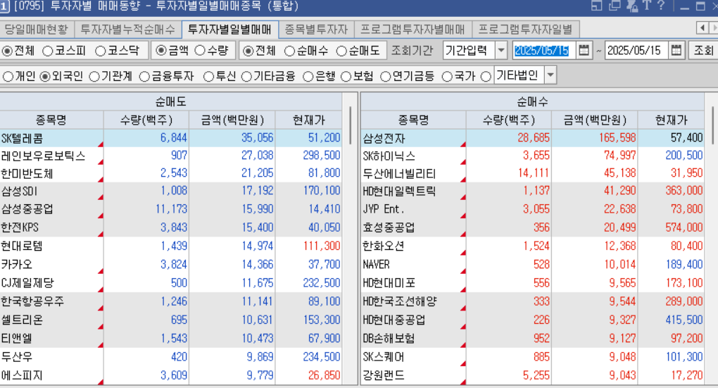 오늘 외국인 순매수 종목은 반도체, 원전, 전력, 엔터, 조선, 보험, 카지노를 순매수함.
