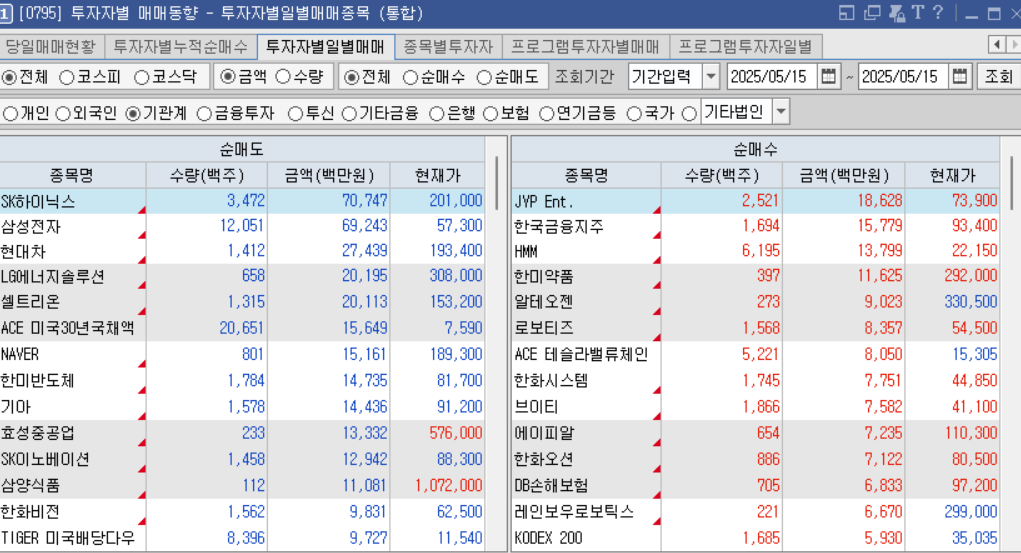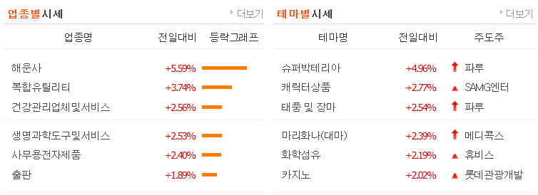기관 순매수 종목은 엔터, 금융, 해운, 로봇, 조선, 미용기기, 보험을 순매수했고