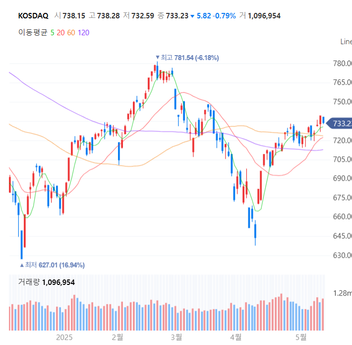 코스닥에서는 외국인 매도세로 하락마감함. 코스닥 지수는 0.79% 하락한 733.23으로 마감.