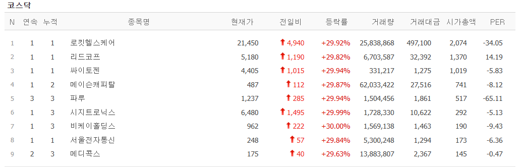 오늘 상한가 종목은 9종목인데 시총 낮은 종목이 절반임. 500억 이하는 제외함.