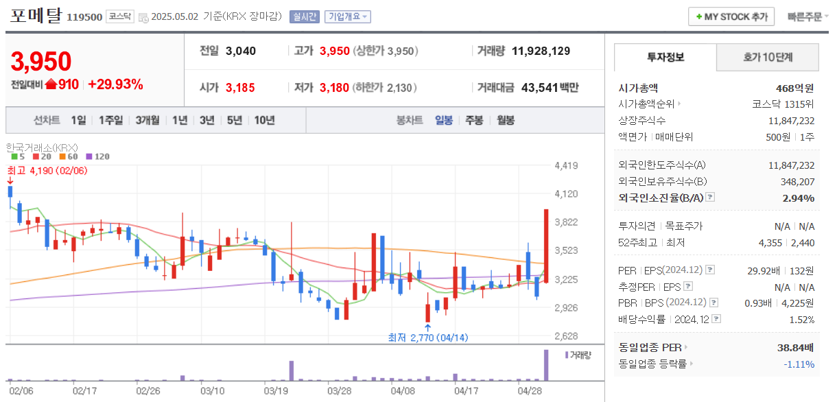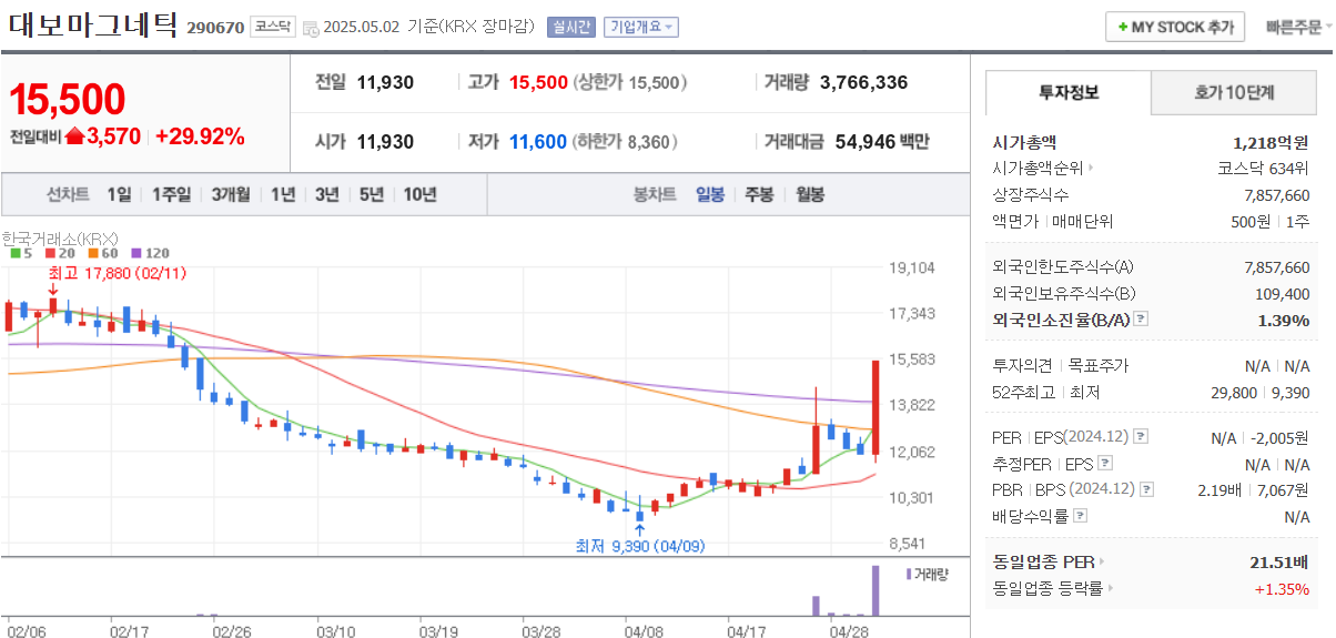 오늘 시총에 가까운 거래대금이 터지면서 상한가 마감함. 상한가 이유로는 특별한 이슈는 없어 보이고