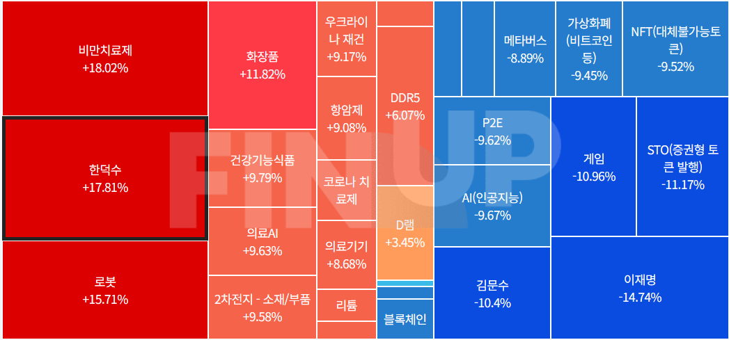 관련주가 크게 상승을 보였고 로봇주, 화장품, AI 의료 , 2차 전지 부품주 등이 상승함.