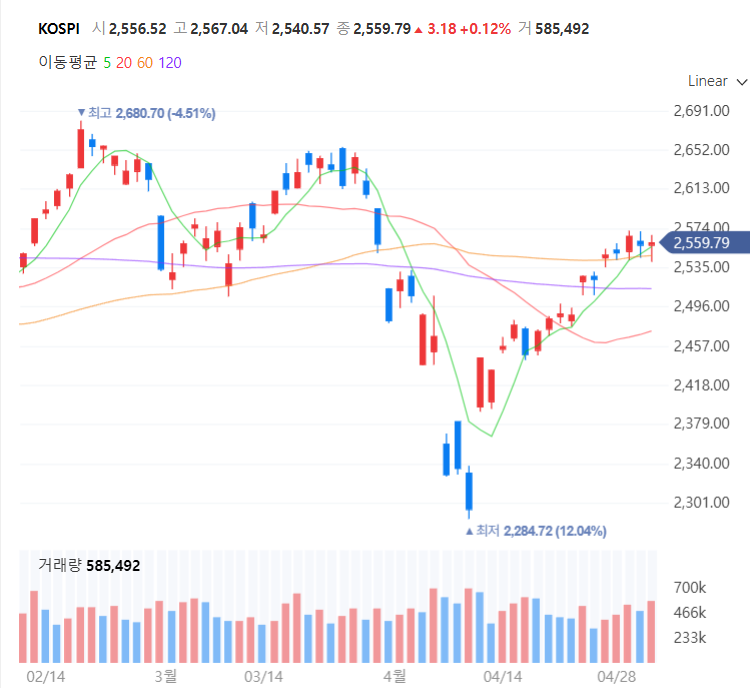 코스피 지수는 0.12% 상승한 2559.79로 마감. 외국인이 1702억 원 순매도, 기관이 3228억 원 순매수.