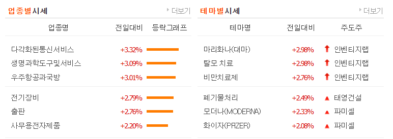 코스닥 시가 총액 상위 종목에서는 제약바이오, 2차 전지, 로봇, 엔터, 화장품, 반도체 장비 등이 상승함.