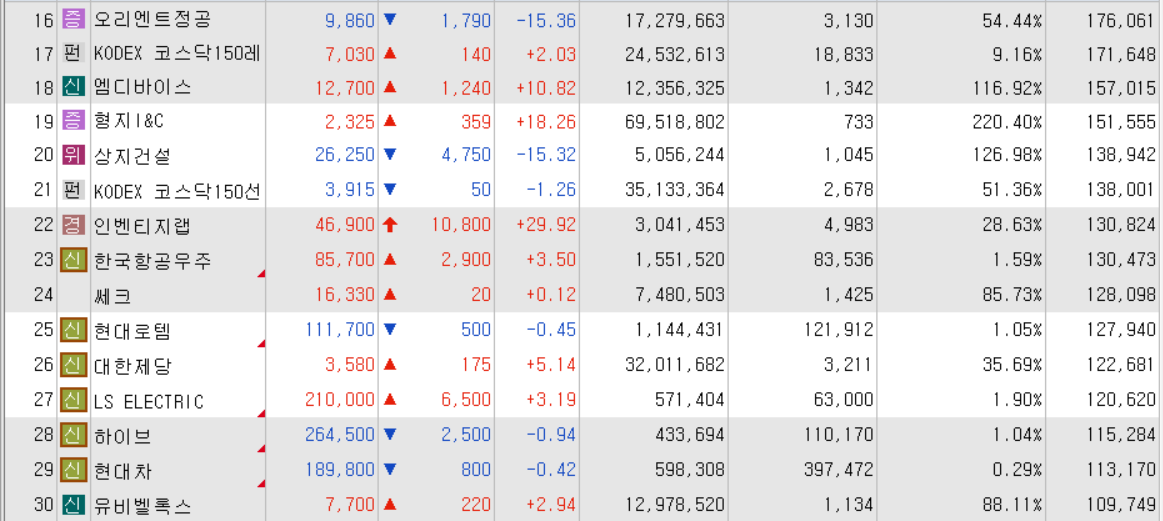 오늘 거래대금 상위 종목에서는 한화그룹주가 다시 상승을 보였고 반도체, 비만치료제, 전력, 방산, 등이 상승함.