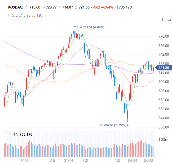 코스닥 지수는 0.64% 상승한 721.86으로 마감. 외국인과 기관이 각각 796억 원, 660억 원 순매수.