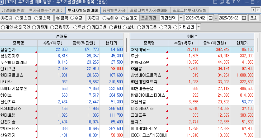 오늘 외국인 순매수 종목은 반도체, 조선, 전력, 게임, 방산, 조선, 제약바이오를 순매수