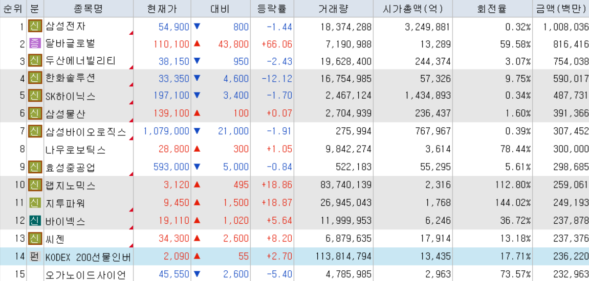 오늘 거래대금 상위 종목에서는 신규상장주인 화장품섹터인 달바글로벌이 신규상장 66% 상승하면서 마감.