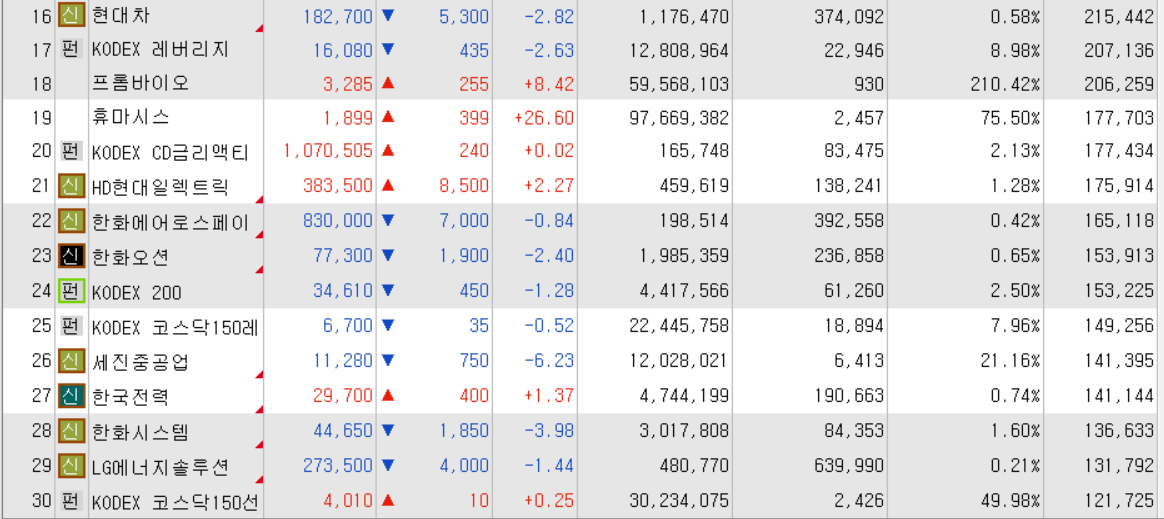 외국인과 기관이 각각 4832억 원, 4320억 원 순매도. 거래대금은 8조 6464억 원으로 1조 2천억 원 늘어남.