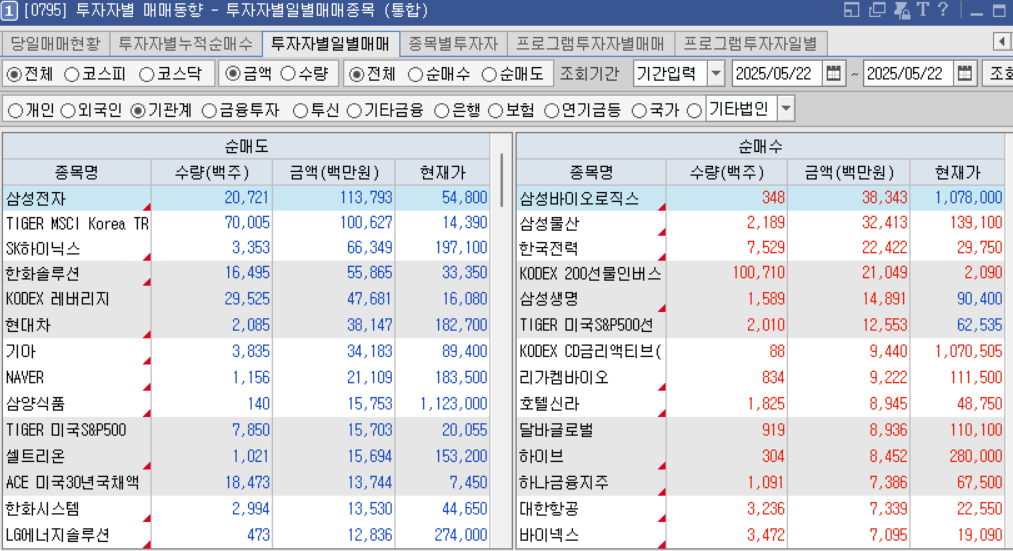 기관 순매수는 제약바이오, 전력, 보험, 신규상장주, 엔터, 금융, 항공등을 순매수.