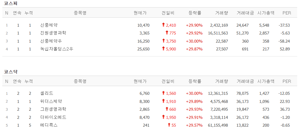 오늘 상한가 종목은 9종목이고 전부 제약바이오 섹터에서 상한가 마감함.