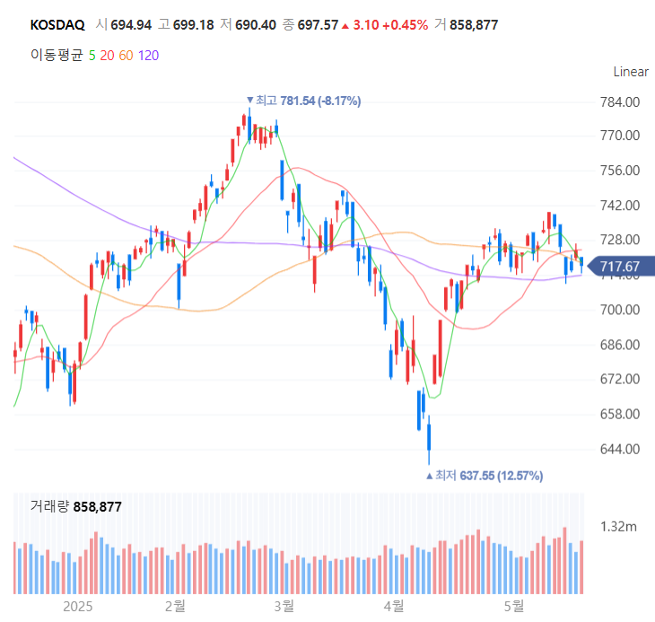 코스닥 지수는 0.82% 하락한 717.67로 마감. 외국인과 기관이 각각 551억 원, 575억 원 순매도.