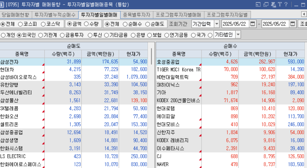 순매도는 반도체, 조선, 원전, 보험, 방산, 전력, 제약주를 순매도함.