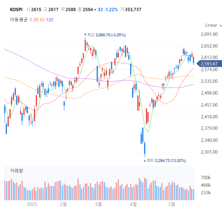 코스피 지수는 1.22% 하락한 2593.67로 다시 2600선을 깨고 하락마감.