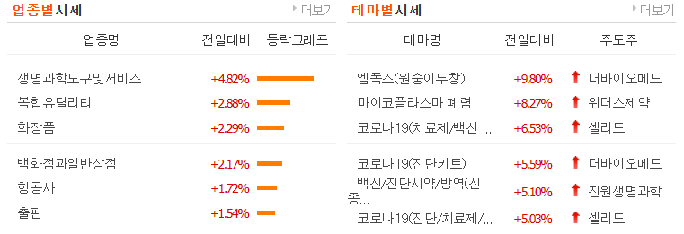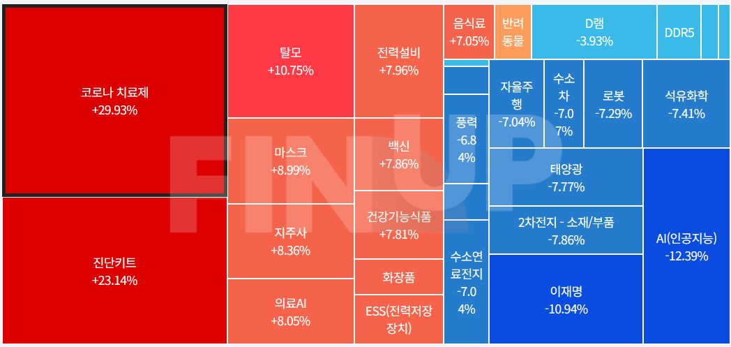 진단키트, 코로나 치료제 관련주가 크게 상승을 했고, 마스크, 탈모등. 제약바이오주가 크게 상승함.