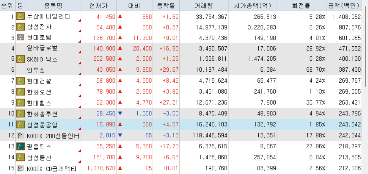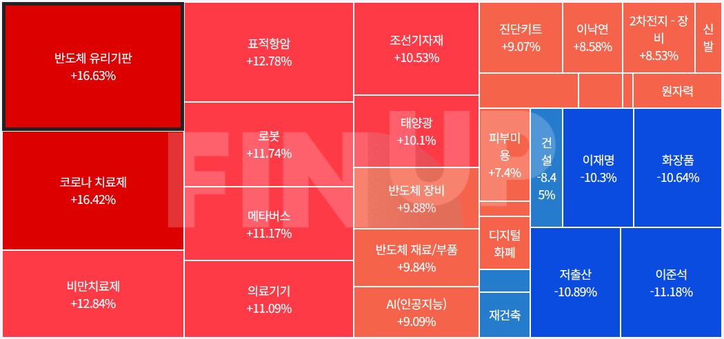 오늘 거래대금 상위 종목에서는 원전, 신규상장주, 건설, 조선, 유리기판, 전력, 제약바이오, 반도체 등이 상승함.