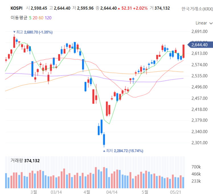 코스피 지수는 2.02% 상승한 2644.40으로 마감. 외국인과 기관이 각각 1016억 원, 4322억 원 순매수함.