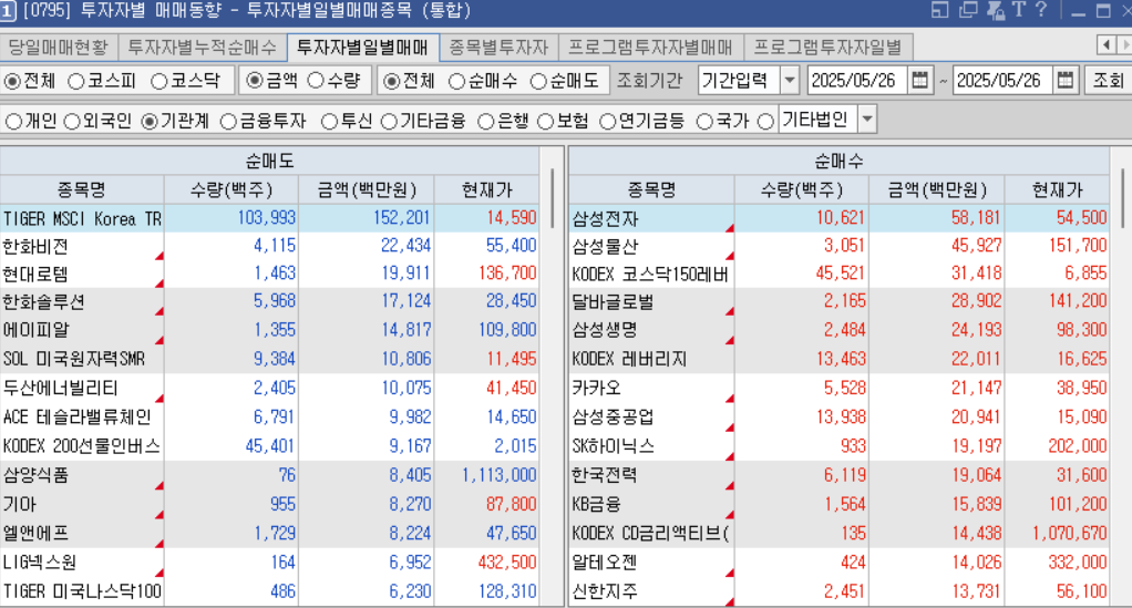 오늘의 기관 순매수는 반도체, 신규상장주, 인터넷, 조선, 전력 금융, 제약바이오를 순매수.