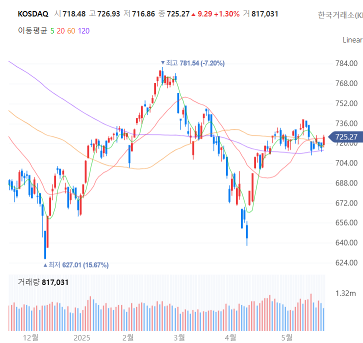코스닥 지수역시 양매수가 나오면서 크게 상승마감. 코스닥 지수는 1.3% 상승한 725.27로 마감.