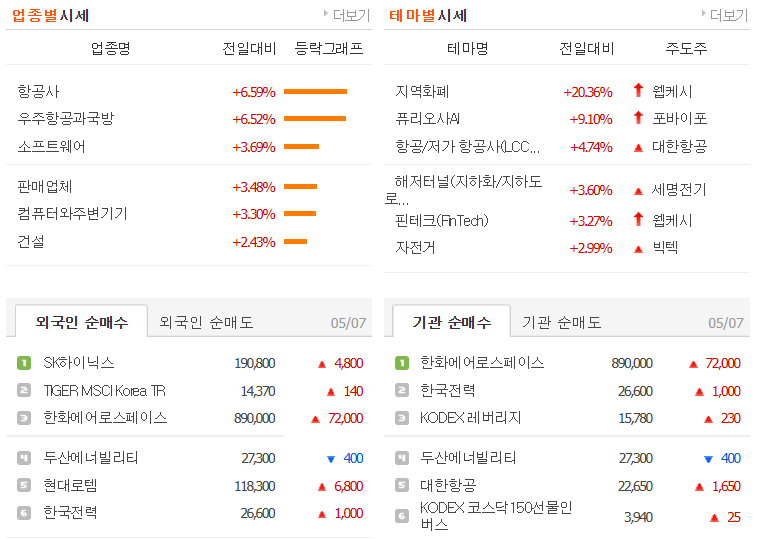기관 순매수는 방산, 항공주, 금융, 원전,전력등을 순매수