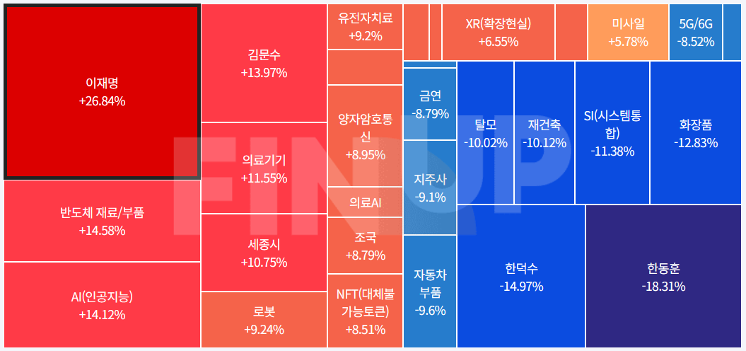 오늘의 특징주 섹터는 이재명 테마주, 김문수 테마주, 로봇주, 세종시 이전테마, 개별이슈