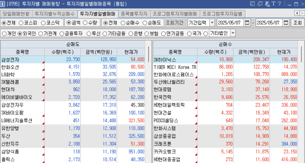 외국인과 기관이 각각 3488억 원, 869억 원 순매수함. 거래대금은 8조 9354억 원으로 5천억 원가량 늘어남.