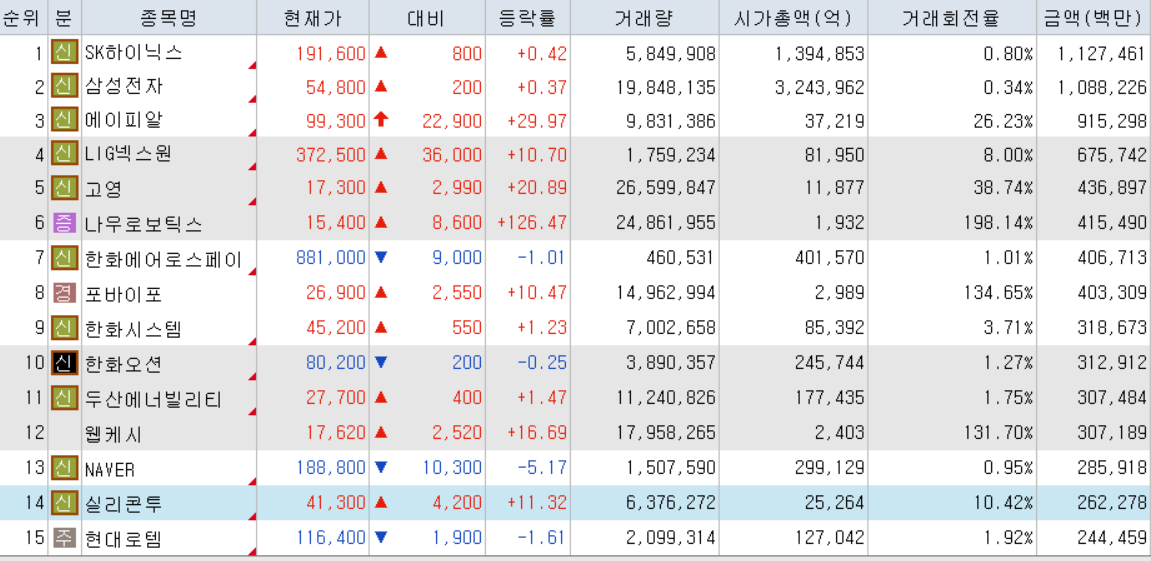 오늘 거래대금 상위 종목