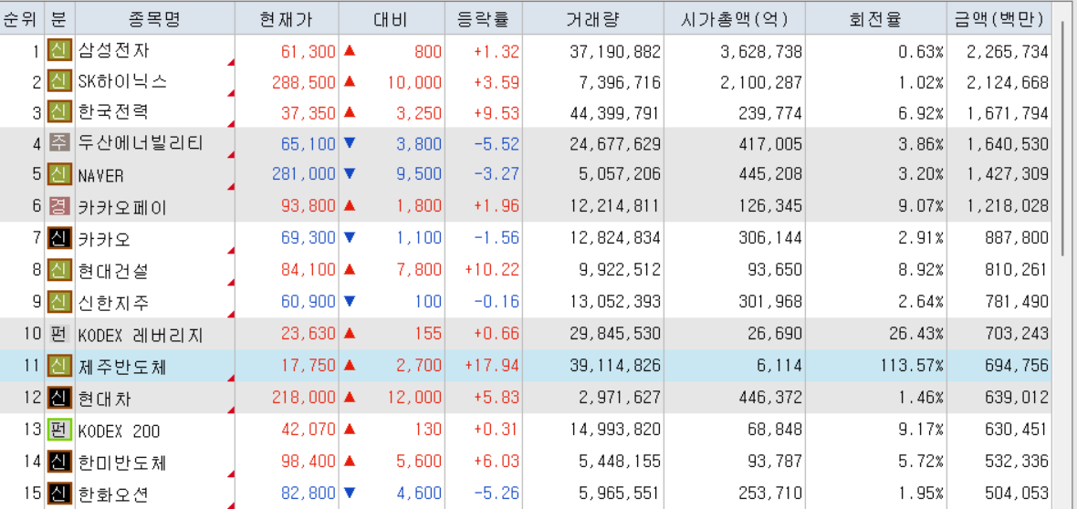 오늘 거래대금 상위 종목에서는 전력주가 크게 상승을 보였고 자동차, 원전, 반도체 등이 크게 상승함.