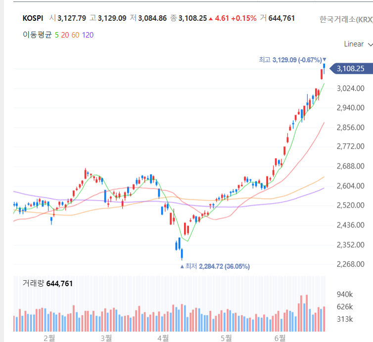 코스피 지수는 0.15% 상승한 3108.25로 마감. 외국인과 기관이 각각 1108억 원, 5883억 원 순매도.
