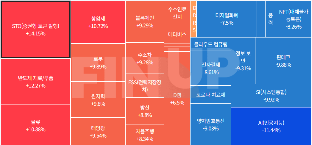 반도체가 강세를 이어갔고, 정부정책 이슈인 STO 증권 토큰 관련주가 오늘 다시 상승을 보였고 , 대체에너지